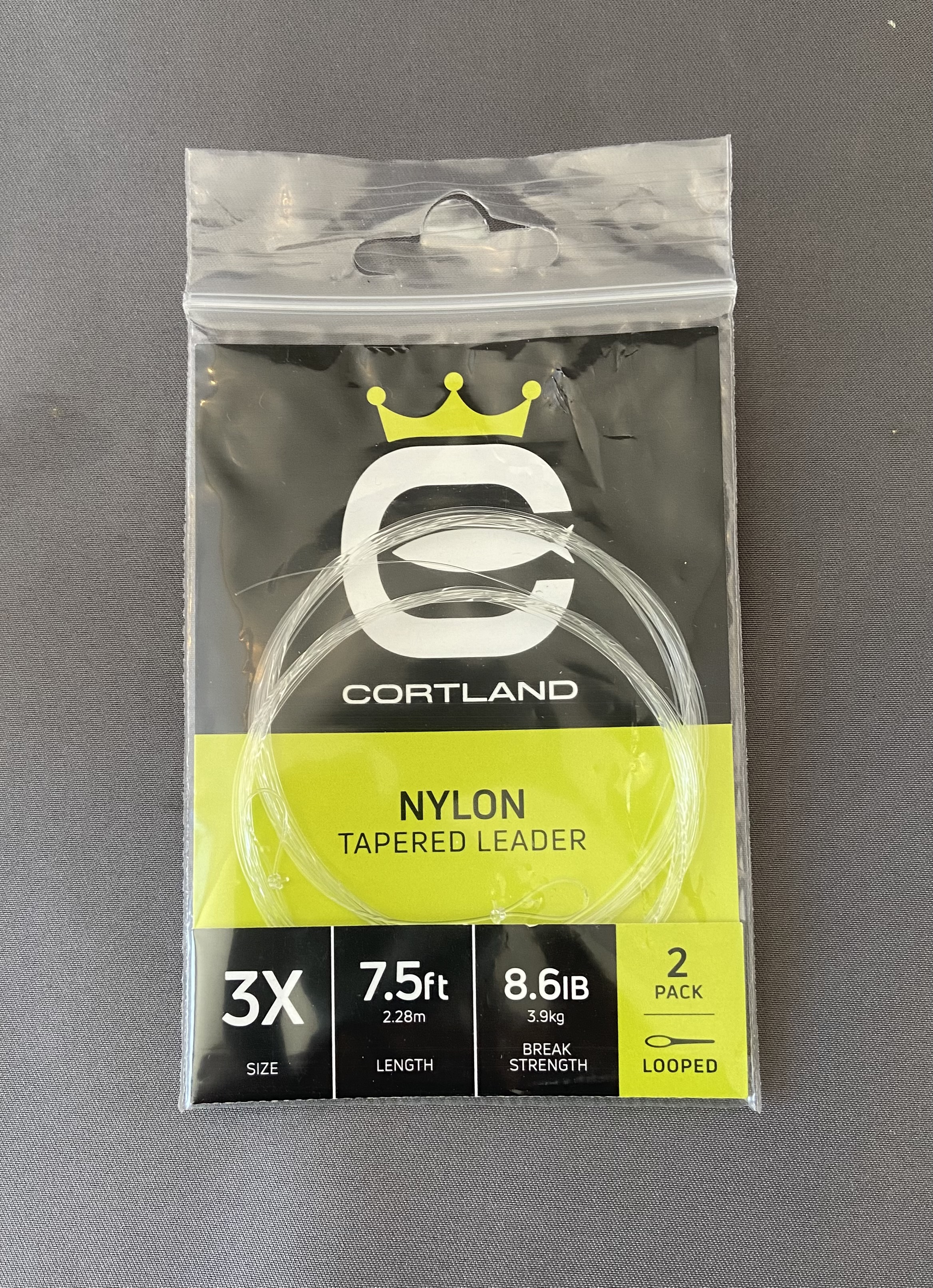 Cortland nylon tapered leaders come in a two pack. These are 7.5 foot in length with a loop built in to connect to the fly line. Just add a length of tippet and your all set.