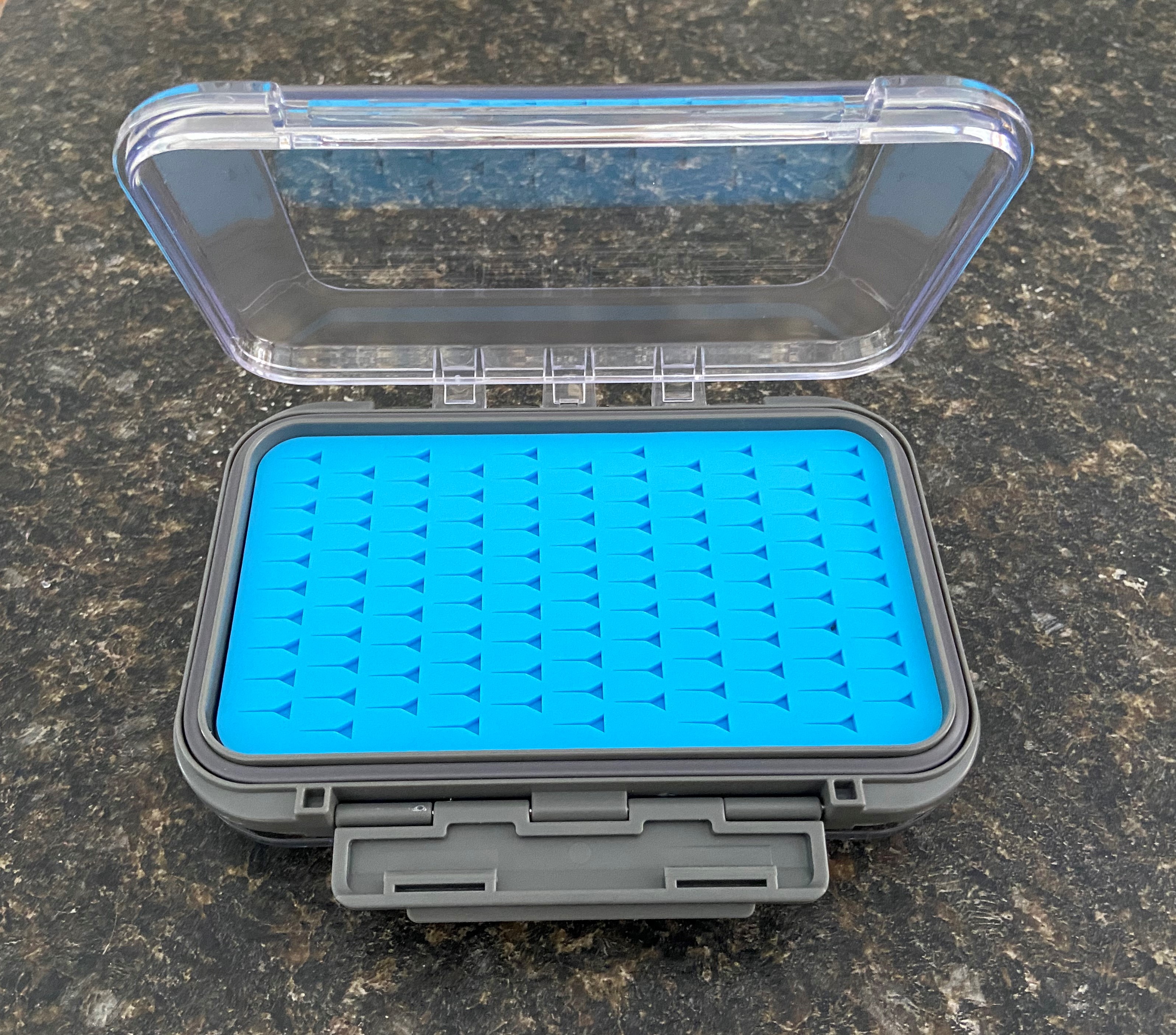FliCon Silicon fly box is waterproof and durable. This box is two sided and measures 4" wide, 6" long x 1 3/4 thick, these are outside demensions. Enough slots to hold up to a couple hundred flies, Very tough box.