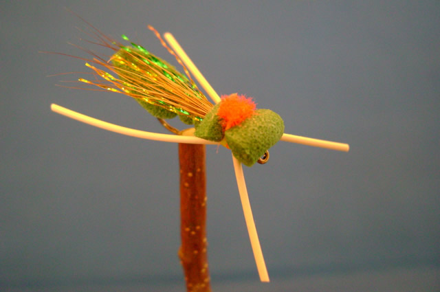 Size #10. If you're someone who finds beauty in simple things, then you will like this hopper pattern. Nothing fancy, just some foam, a little flash, rubber legs and some deer hair. Now, add water and you're fishing! No floatant needed, this fly will float all day, just cast it into a likely spot, like near the stream bank where there is plenty of vegetation. Give it just a couple of little short jerks, let it rest, then some more little short jerks ( just enough to move the legs ) let rest again, and be ready. Trout love hoppers!